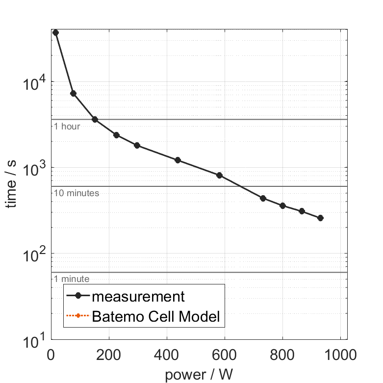 The cell is discharged from 100% SOC with different constant currents at 25°C. The thermal boundary condi­tion is free convec­tion. The measure­ment stops when reaching either the voltage of 2.5V or the surface temper­a­ture of 60°C. The graph shows the derived exper­i­ment duration and average power of the experiment.