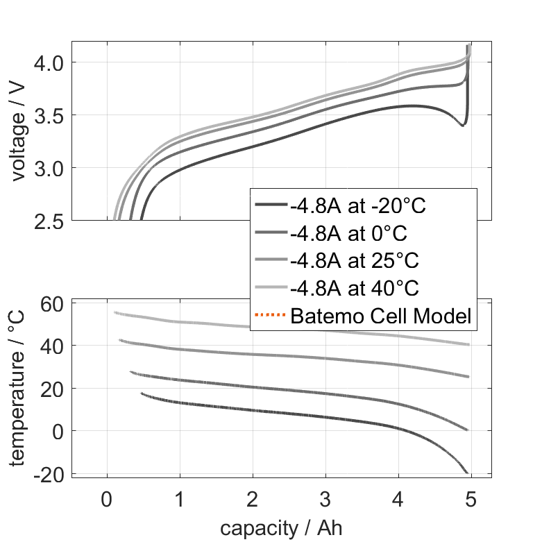 The cell is discharged from 100% SOC with different constant currents at different ambient temper­a­tures. The thermal boundary condi­tion is free convec­tion. The measure­ment stops when reaching either the voltage of 2.5V or the surface temper­a­ture of 60°C.