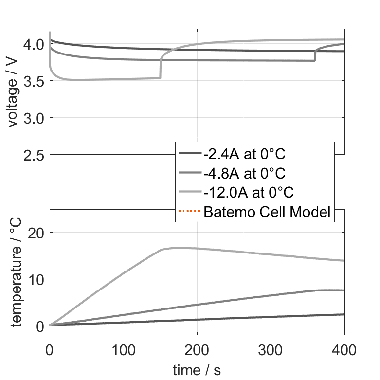 The cell is discharged from 100% SOC with current pulses followed by no-load phases at different ambient temper­a­tures. The thermal boundary condi­tion is free convec­tion. The measure­ment stops when reaching either the voltage of 2.5V or the surface temper­a­ture of 60°C. The graph shows a zoomed view of the measure­ment to visualize one of the pulses.