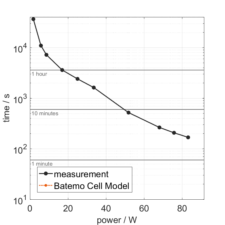 The cell is discharged from 100% SOC with different constant currents at 25°C. The thermal boundary condi­tion is free convec­tion. The measure­ment stops when reaching either the voltage of 2.5V or the surface temper­a­ture of 60°C. The graph shows the derived exper­i­ment duration and average power of the experiment.