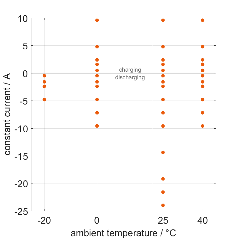 The cell is discharged from 100% SOC or charged from 0% SOC with different constant currents at different ambient temper­a­tures. The thermal boundary condi­tion is free convec­tion. The measure­ment stops when reaching either the voltage of 2.5V or 4.2V or the surface temper­a­ture of 60°C. The graph shows for which ambient temper­a­tures and charging and discharging constant currents measure­ments are available.