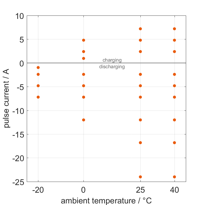 The cell is discharged from 100% SOC or charged from 0% SOC with current pulses followed by no-load phases at different ambient temper­a­tures. The thermal boundary condi­tion is free convec­tion. The measure­ment stops when reaching either the voltage of 2.5V or 4.2V or the surface temper­a­ture of 60°C. The graph shows for which ambient temper­a­tures and pulse currents measure­ments are available.