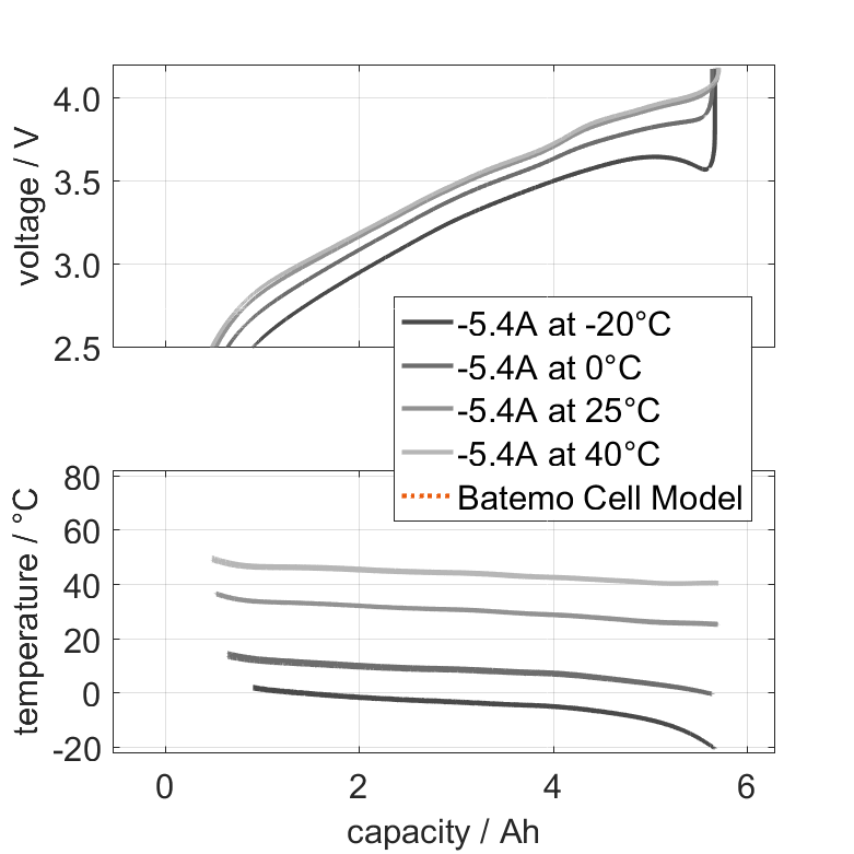 The nominal capacity originates from the manufacturer’s data sheet, if available. When the data sheet is unavailable, the nominal capacity is estimated. Batemo measured the C/10 capacity by discharging the cell at an ambient temperature of 25°C from 100% with a constant current of 0.54A (0.1C) until reaching the voltage of 2.5V. The thermal boundary condition is free convection. |