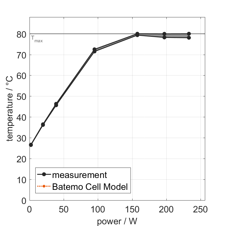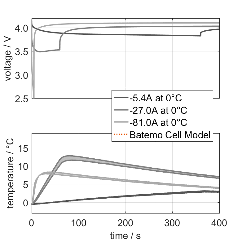 The Batemo Cell Model of the lithium-ion battery cell V4Drive V21700HEP-5.X(A0) is a high-precision, physical cell model with global validity. As a digital twin it seamlessly integrates into your research, development and battery analytics by basing your decisions on simulations. See the details to learn more about the features and capabilities of the Batemo Cell Model. Batemo demonstrates the accuracy and validity of the Batemo Cell Model by comparing battery simulation and measurement data in the range given below. Validation is extensive, experimental characterization covers the total operational area of the cell: At low and high temperatures, up to the maximal current and in the whole state of charge range.