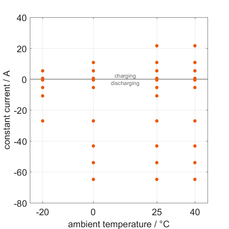 The cell is discharged from 100% SOC or charged from 0% SOC with different constant currents at different ambient temperatures. The thermal boundary condition is free convection. The measurement stops when reaching either the voltage of 2.5V or 4.2V or the surface temperature of 80°C. The graph shows for which ambient temperatures and charging and discharging constant currents measurements are available.
