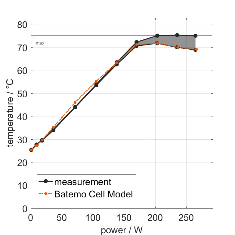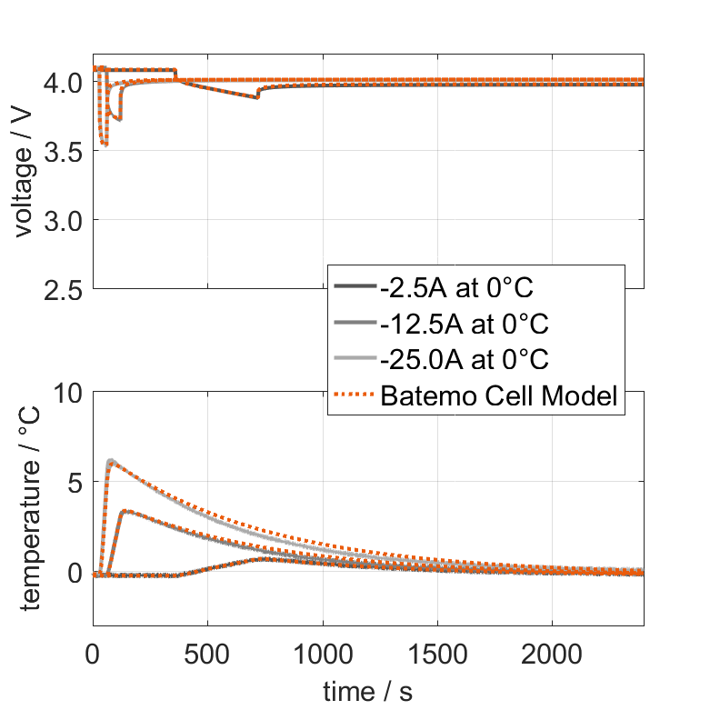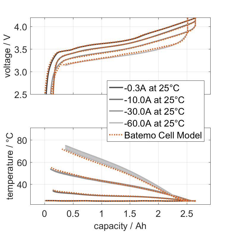 Batemo demonstrates the accuracy and validity of the Batemo Cell Model by comparing battery simulation and measurement data in the range given below. Validation is extensive, experimental characterization covers the total operational area of the cell: At low and high temperatures, up to the maximal current and in the whole state of charge range.