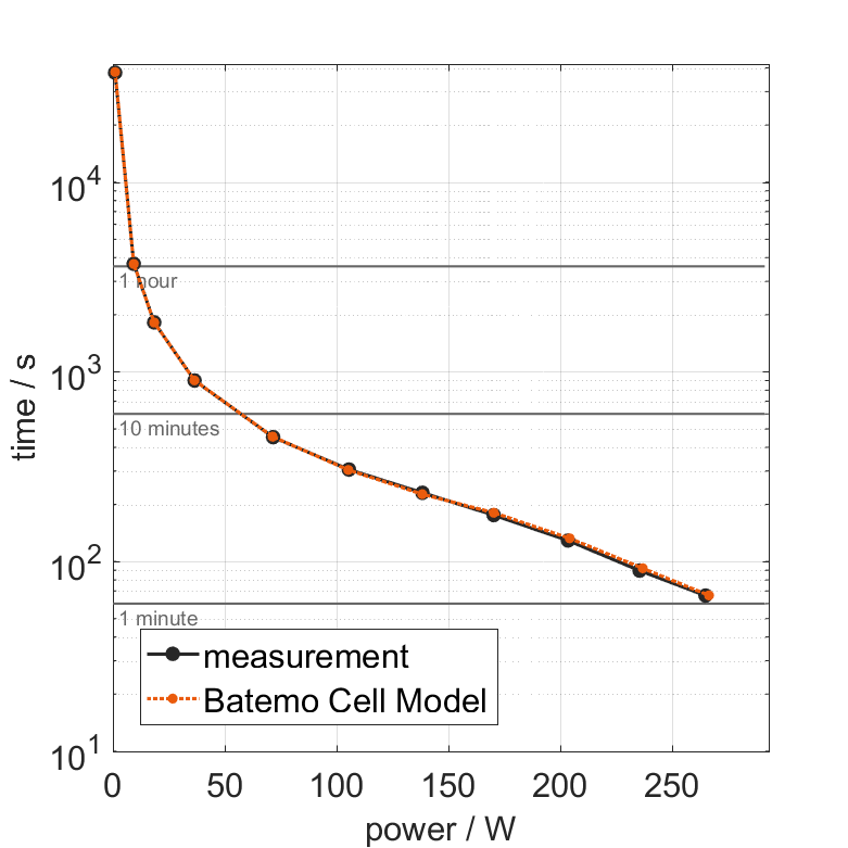 All quantities are measurement results from the Batemo battery laboratory. The continuous power is the highest power that completely discharges the cell without overheating it. Therefore, the cell is discharged from 100% state of charge (SOC) at an ambient temperature of 25°C with a constant current until a residual state of charge of 10% and either the lower voltage limit of 2.5V or 90% of the maximum surface temperature ( 68°C) is reached. The peak power is the power the cell can supply for 5 minutes. The cell is therefore discharged from 100% SOC at an ambient temperature of 25°C with a constant current until it reaches either the lower voltage limit of 2.5V or the maximum surface temperature of 75°C after 5 minutes. For cells that reach the maximum temperature limit, the measured power is directly taken as peak power. For cells that do not reach the maximum surface temperature after 5 minutes because they reach the lower voltage limit first, the measured power is multiplied by a correction factor that estimates the power that would have heated the cell to the maximum surface temperature within 5 minutes. The thermal boundary condition is free convection. These operating conditions may be outside the cell manufacturer’s specification. |