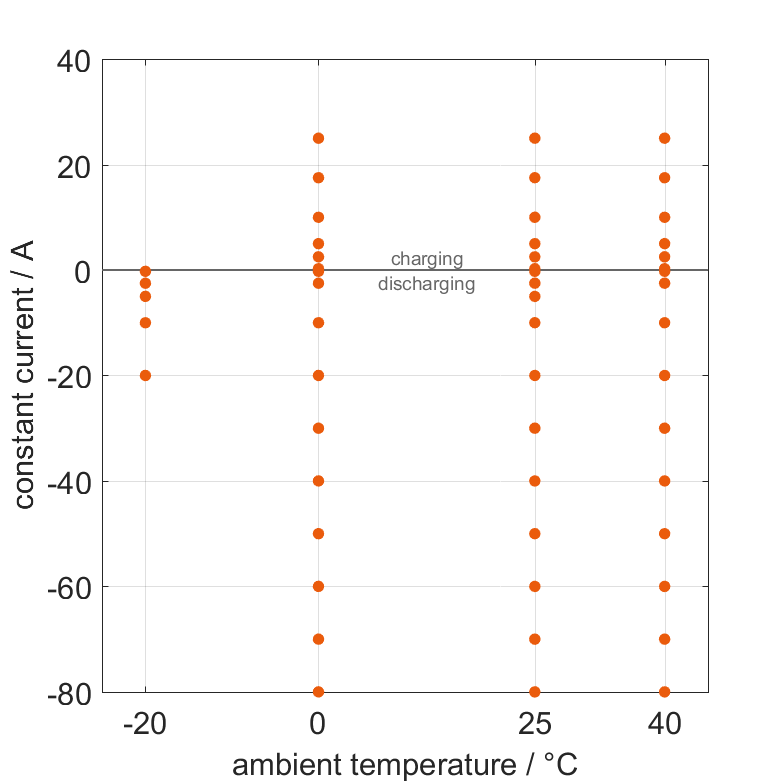 The cell is discharged from 100% SOC or charged from 0% SOC with different constant currents at different ambient temperatures. The thermal boundary condition is free convection. The measurement stops when reaching either the voltage of 2.5V or 4.2V or the surface temperature of 75°C. The graph shows for which ambient temperatures and charging and discharging constant currents measurements are available.