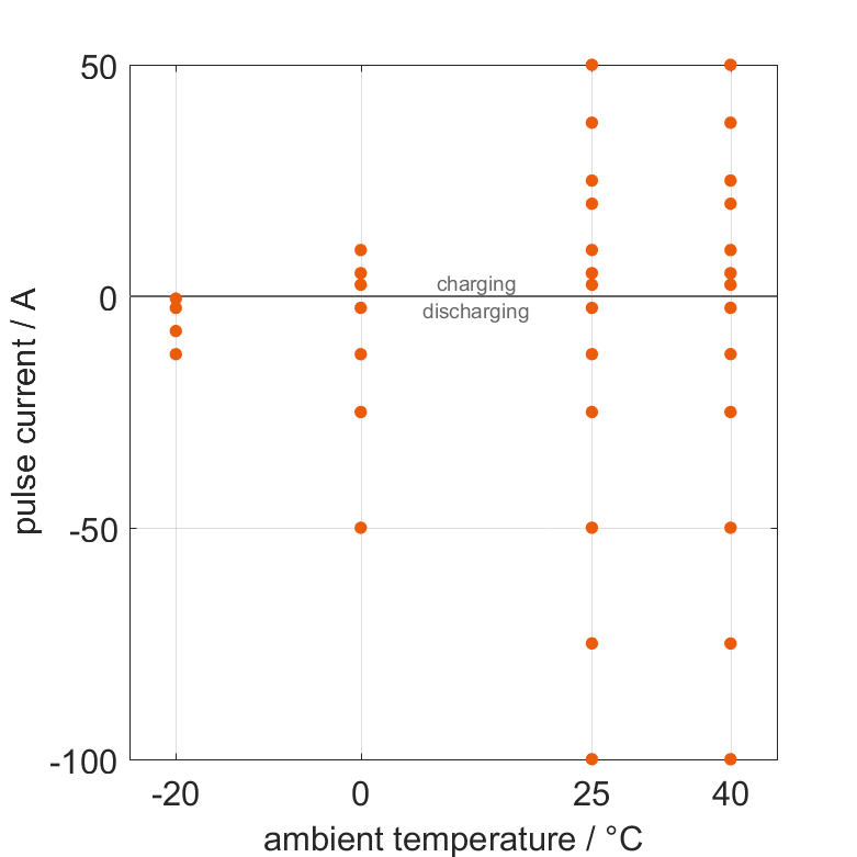 The cell is discharged from 100% SOC or charged from 0% SOC with current pulses followed by no-load phases at different ambient temperatures. The thermal boundary condition is free convection. The measurement stops when reaching either the voltage of 2.5V or 4.2V or the surface temperature of 75°C. The graph shows for which ambient temperatures and pulse currents measurements are available.